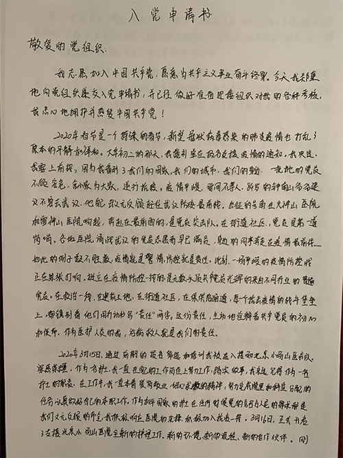 在北京小汤山定点医院的工作中,我无时无刻不感受到从事这份工作的使命与光荣。“疫情就是命令,防控就是责任。”挺立在疫情防控一线的是无数头顶共产党员光辉的来自不同行业的普通党员。他们用行动书写“责任”两字。这份责任,生动地诠释着共产党员的初心和使命。我是一名医护人员,治病救人就是我的责任。在2020年3月26日这个日子,我向党组织递交了入党申请书。我希望自己也能像其他党员一样具有担当精神,能够忠诚履责,迎难而上,挺身而出。