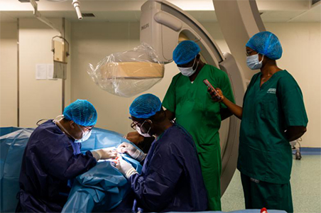 器械耗材短缺的难题,则在中几双方的联动协调下逐步化解。在国家卫健委、北京市卫健委及首都医科大学附属北京友谊医院的统筹支持下,中国医疗队的努力下,为满足手术的需求,配置了动静脉内瘘器械、股动脉取栓器械,解决了急需的取栓导管和血管缝线。针对当地介入耗材供应不足的问题,依托心脑血管一体化项目和中非联合医学中心解决了一些介入耗材,成功开展多例下肢动脉闭塞、动静脉内瘘介入手术。物资与技术的双重保障,不仅为患者带来福音,更让当地医务人员感受到中国医疗的实力与温度,进一步激发了他们深耕血管外科领域的热情。