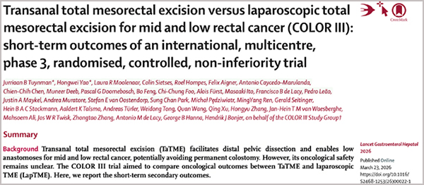 COLOR III研究首篇研究结果的发表,不仅用高级别循证医学证据证实了TaTME手术在直肠癌治疗中的安全性和技术优势,更为全球结直肠外科医生提供了重要的临床实践指导。